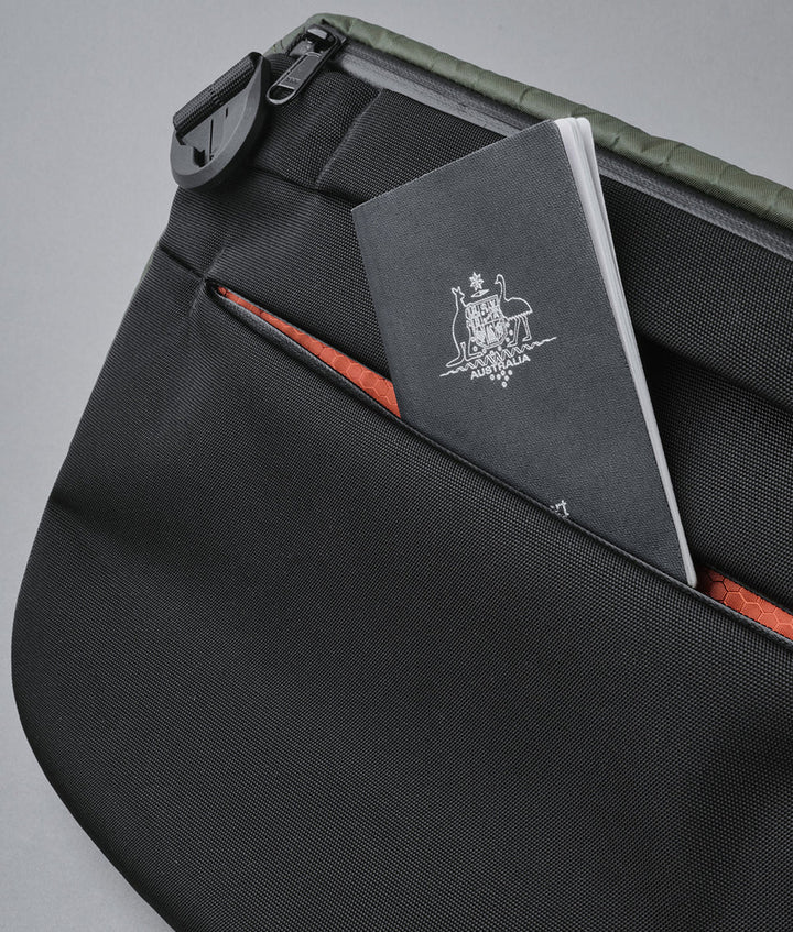 - Quick-access front zip compartment with RFID blocking and internal pockets