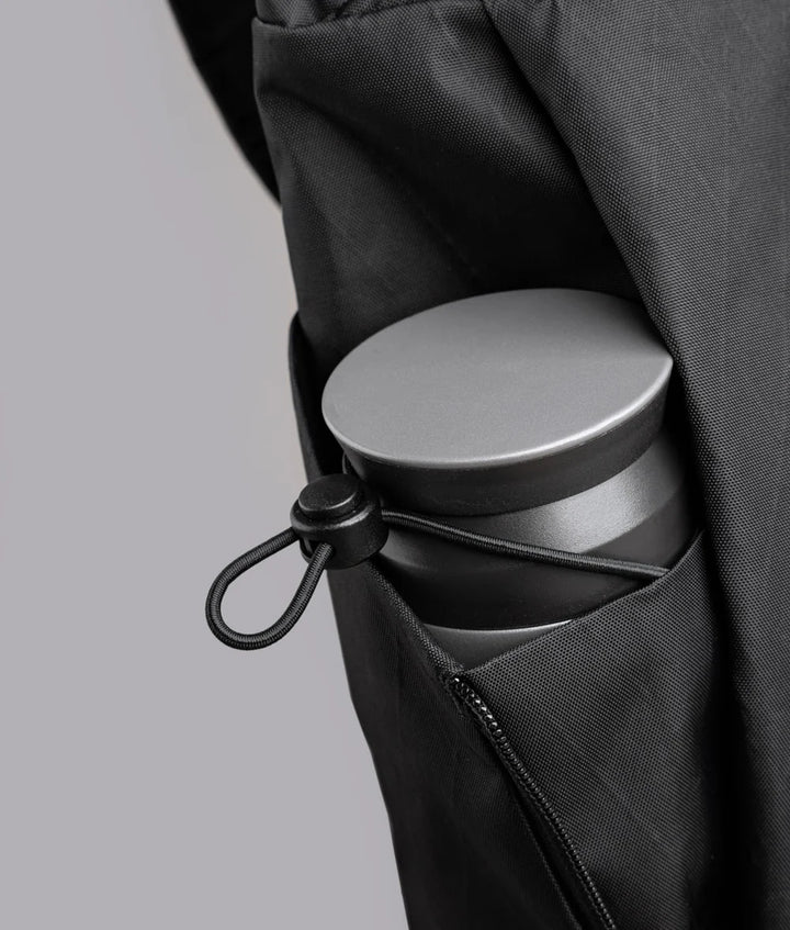 - Expandable water bottle pocket with elastic cinch